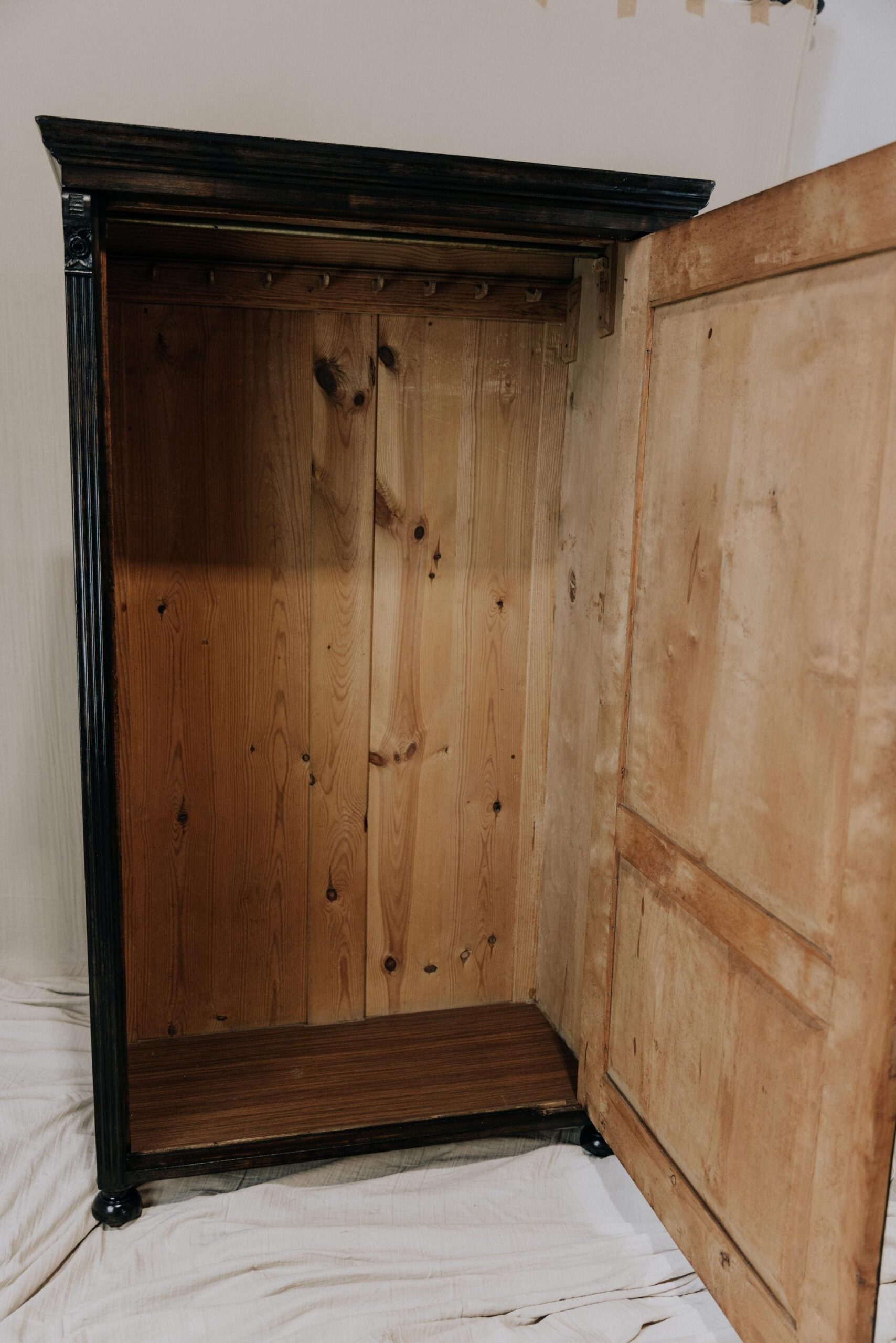 Die elegante Patina macht ihn zu einem echten antik Kleiderschrank, während die hochwertige Verarbeitung ihn zu einem langlebigen Möbelstück für Generationen werden lässt. Ideal für Liebhaber von Holz Möbeln, die Wert auf Substanz, Geschichte und zeitloses Design legen.