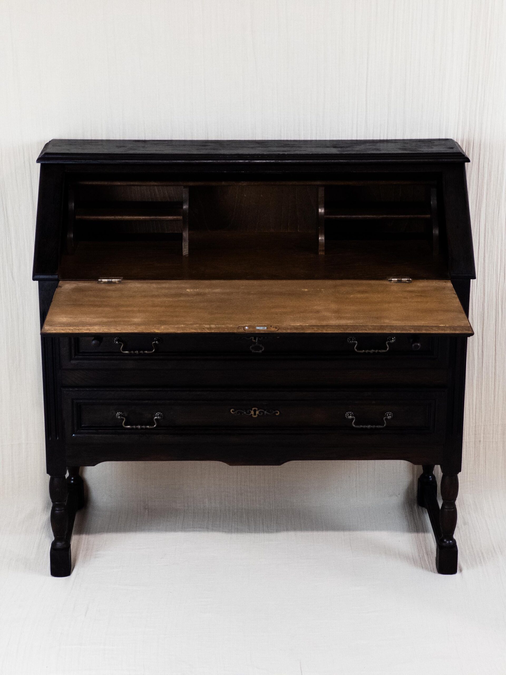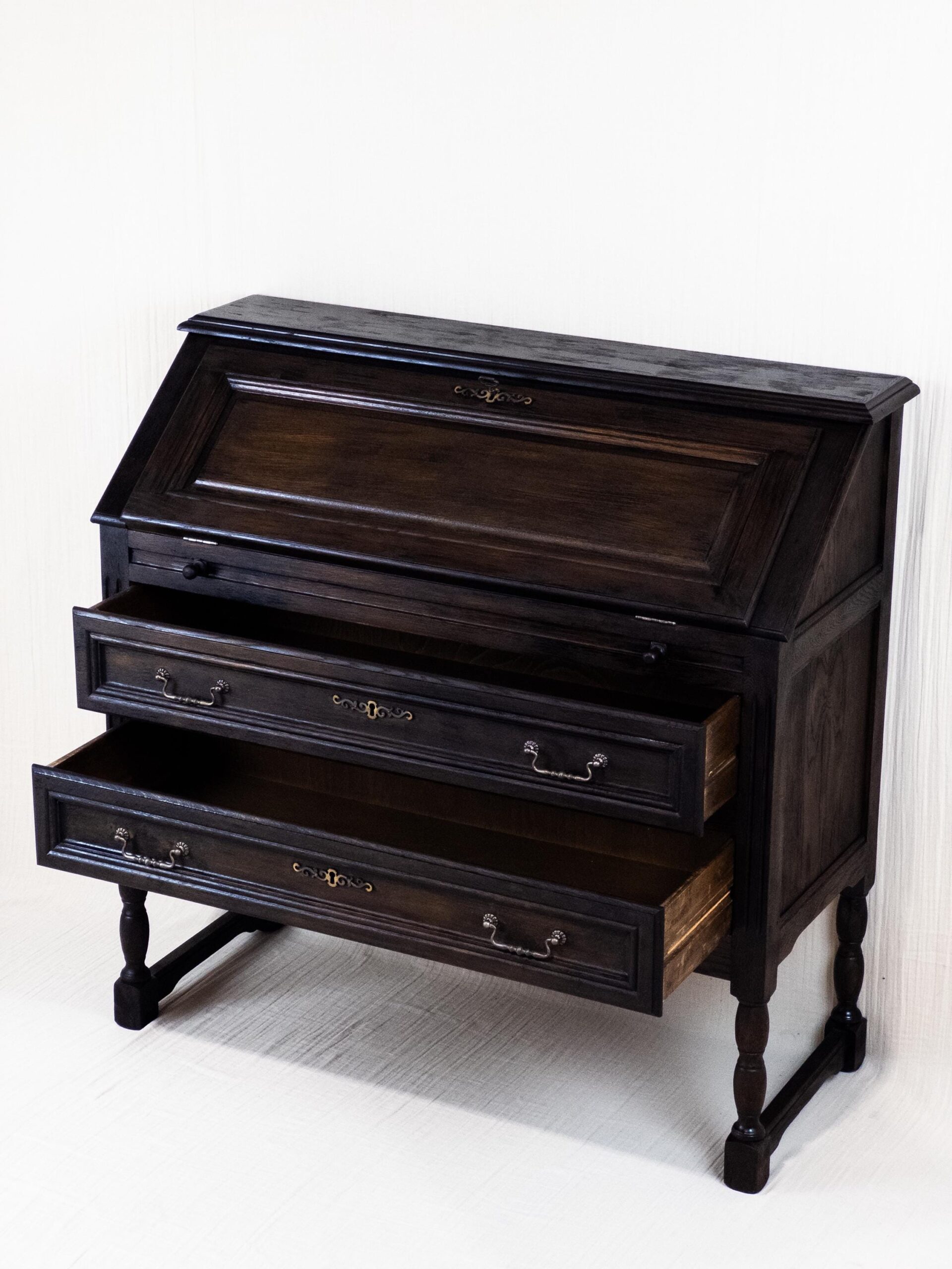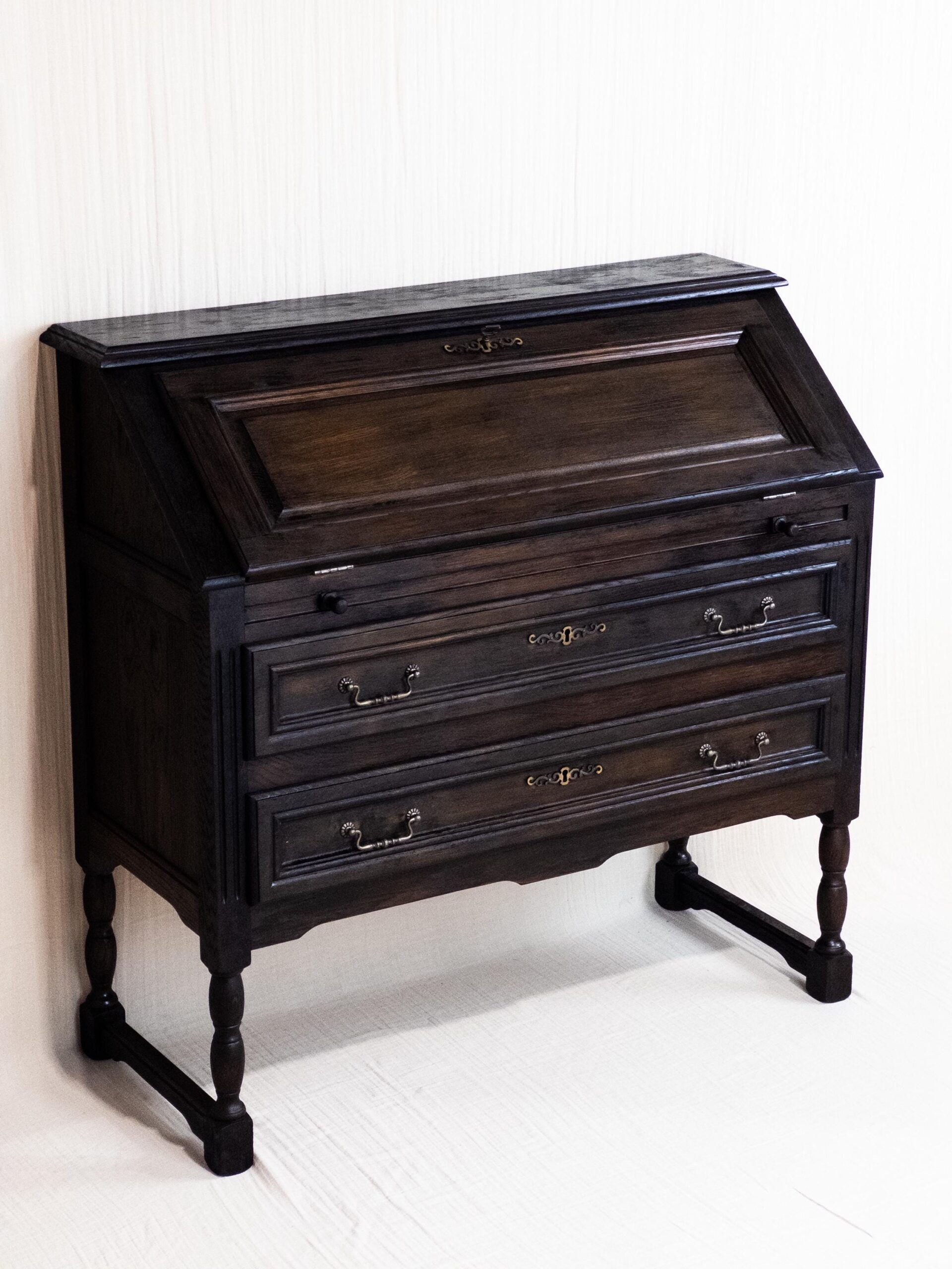 Mit seinen klaren Linien, dekorativen Details und der edlen dunklen Holzfarbe ist er ein echtes Statement-Piece. Der Sekretär wurde sorgfältig restauriert, um seinen historischen Charakter zu bewahren und gleichzeitig eine hochwertige, langlebige Qualität zu gewährleisten.
