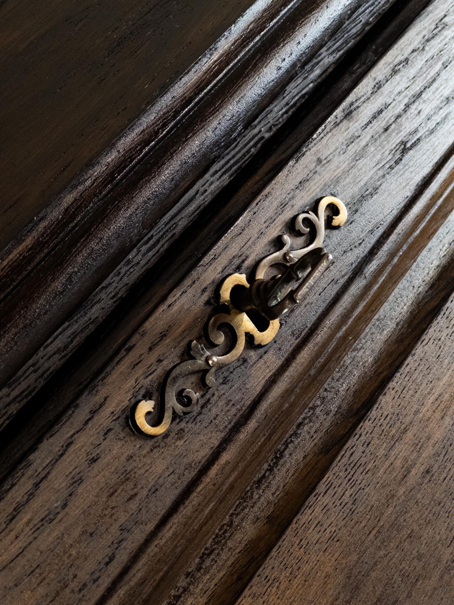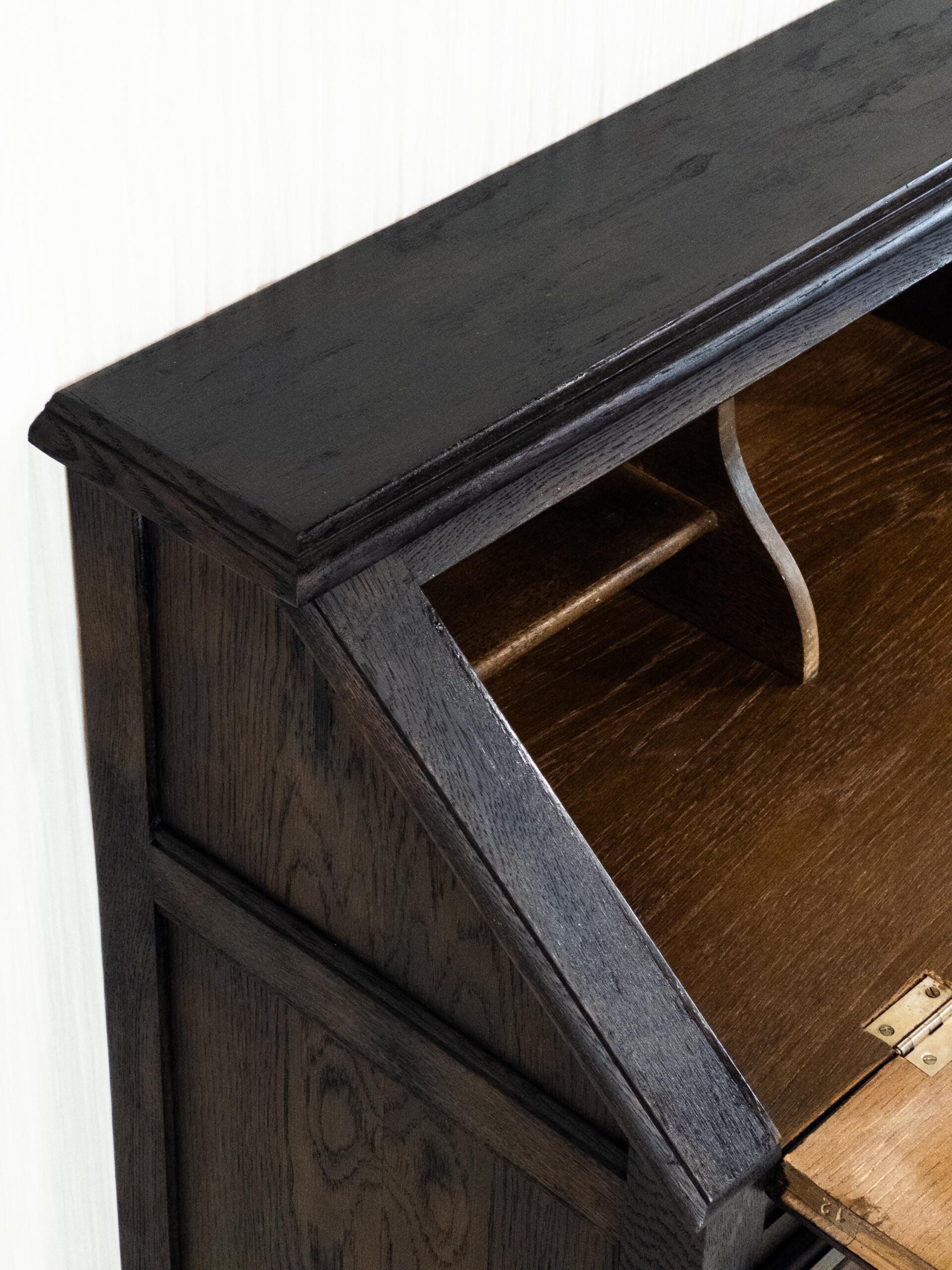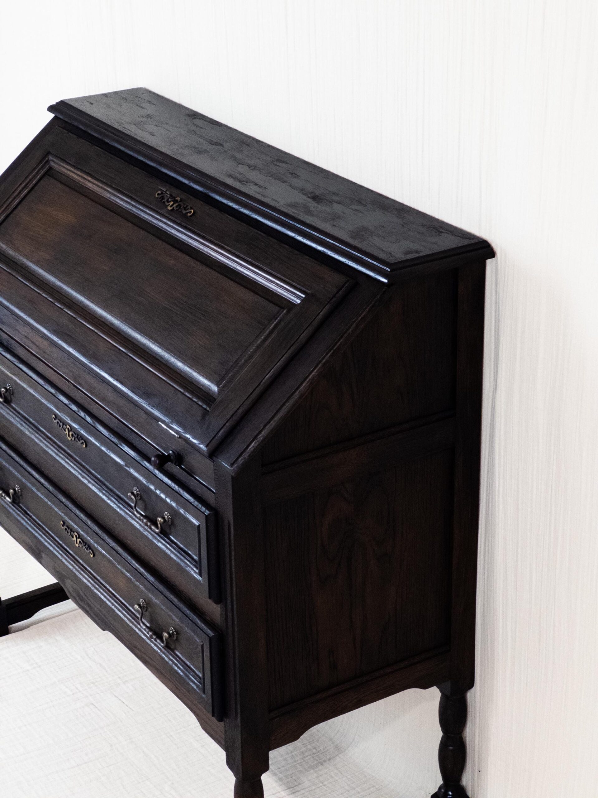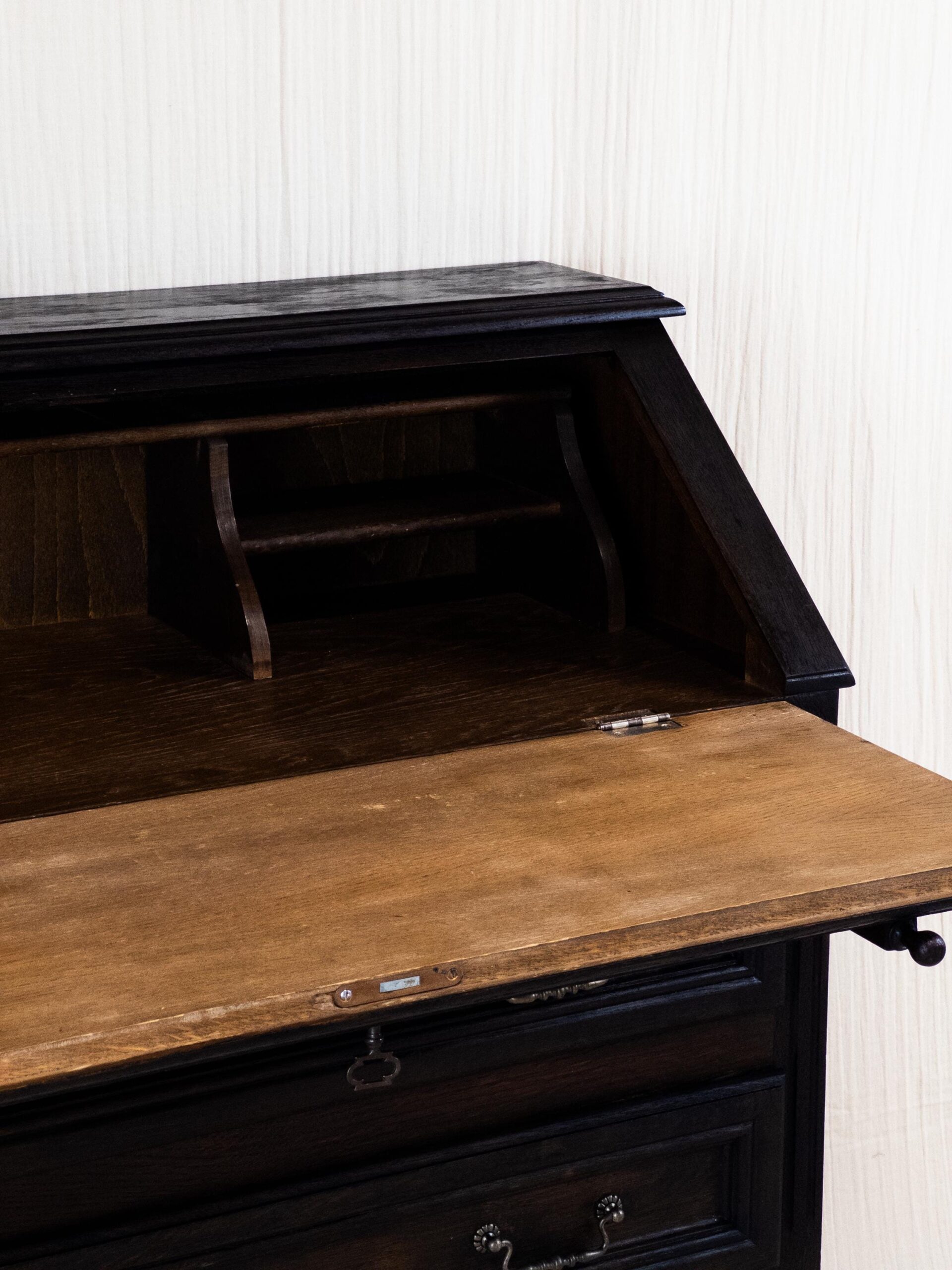 Mit seinen klaren Linien, dekorativen Details und der edlen dunklen Holzfarbe ist er ein echtes Statement-Piece. Der Sekretär wurde sorgfältig restauriert, um seinen historischen Charakter zu bewahren und gleichzeitig eine hochwertige, langlebige Qualität zu gewährleisten.