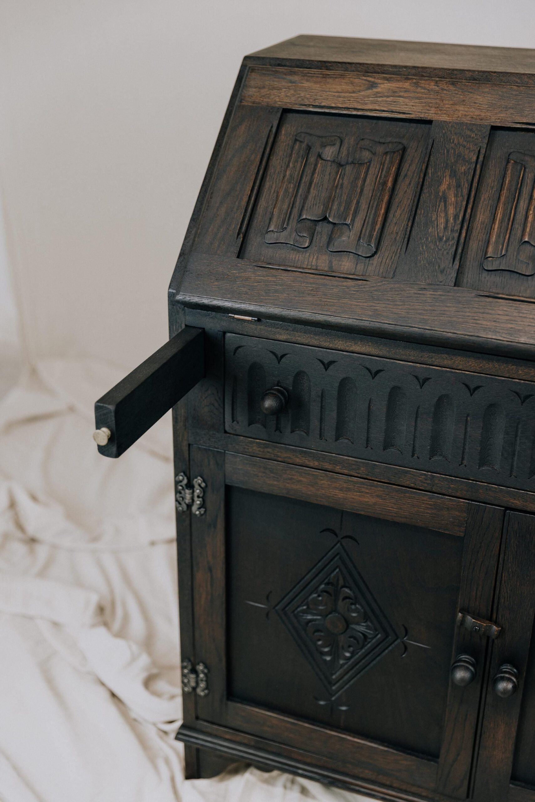 Sekretär antik schwarz aus massivem Holz – Eleganter Schreibschrank für stilvolle Einrichtung – Sekretär Vintage aus Massiv Altholz schwarz