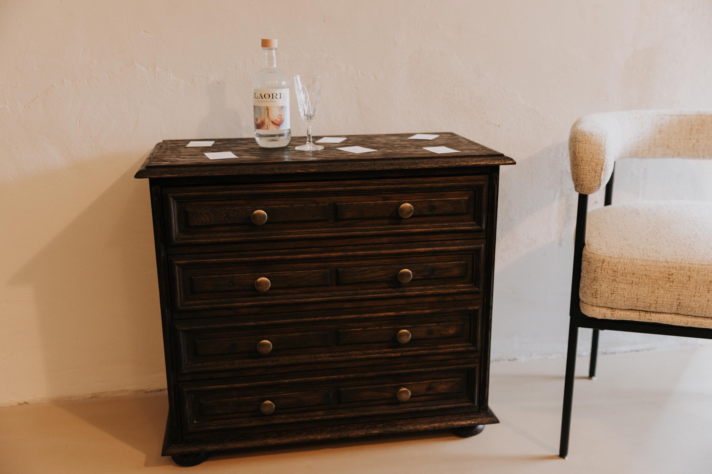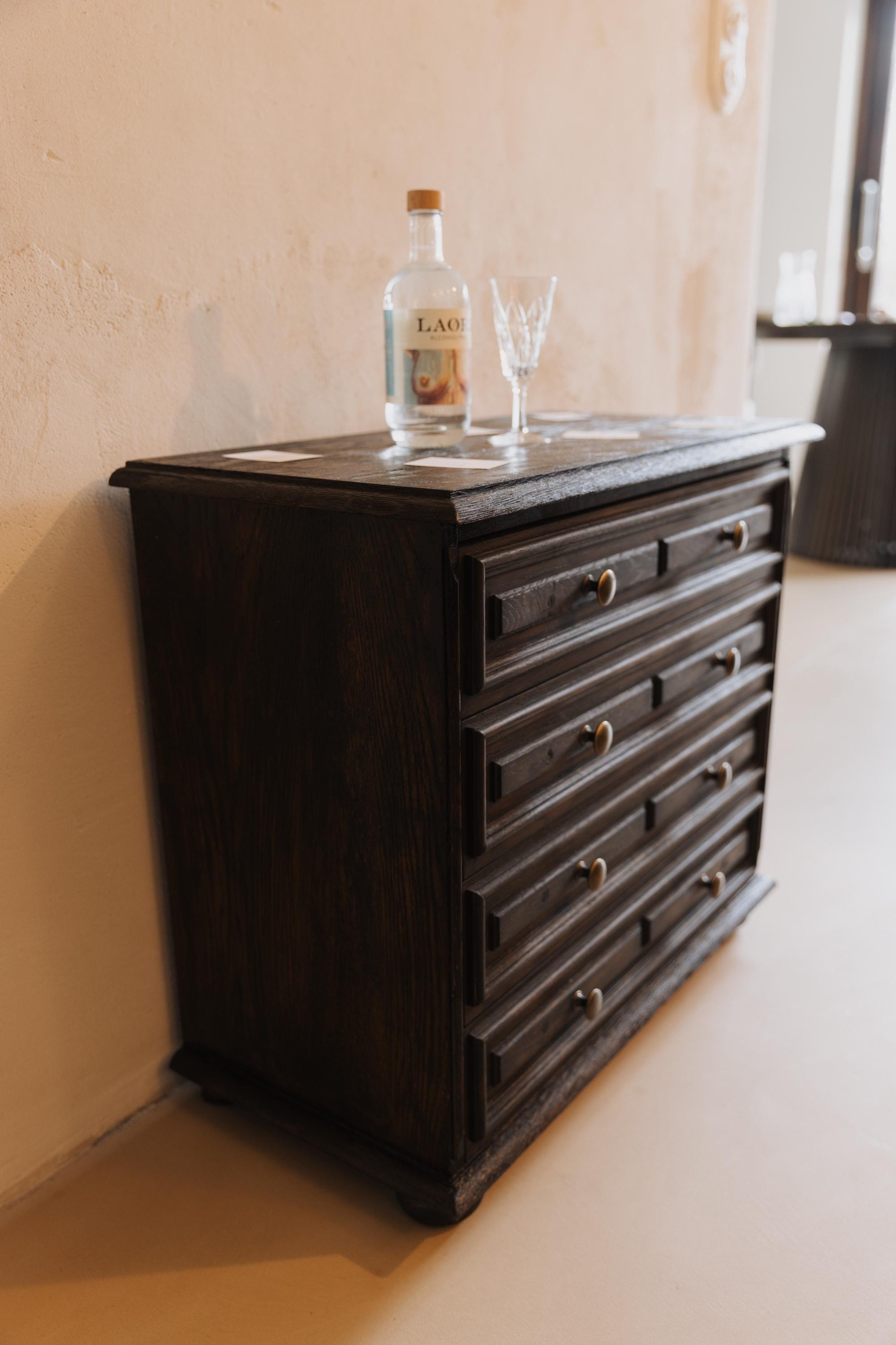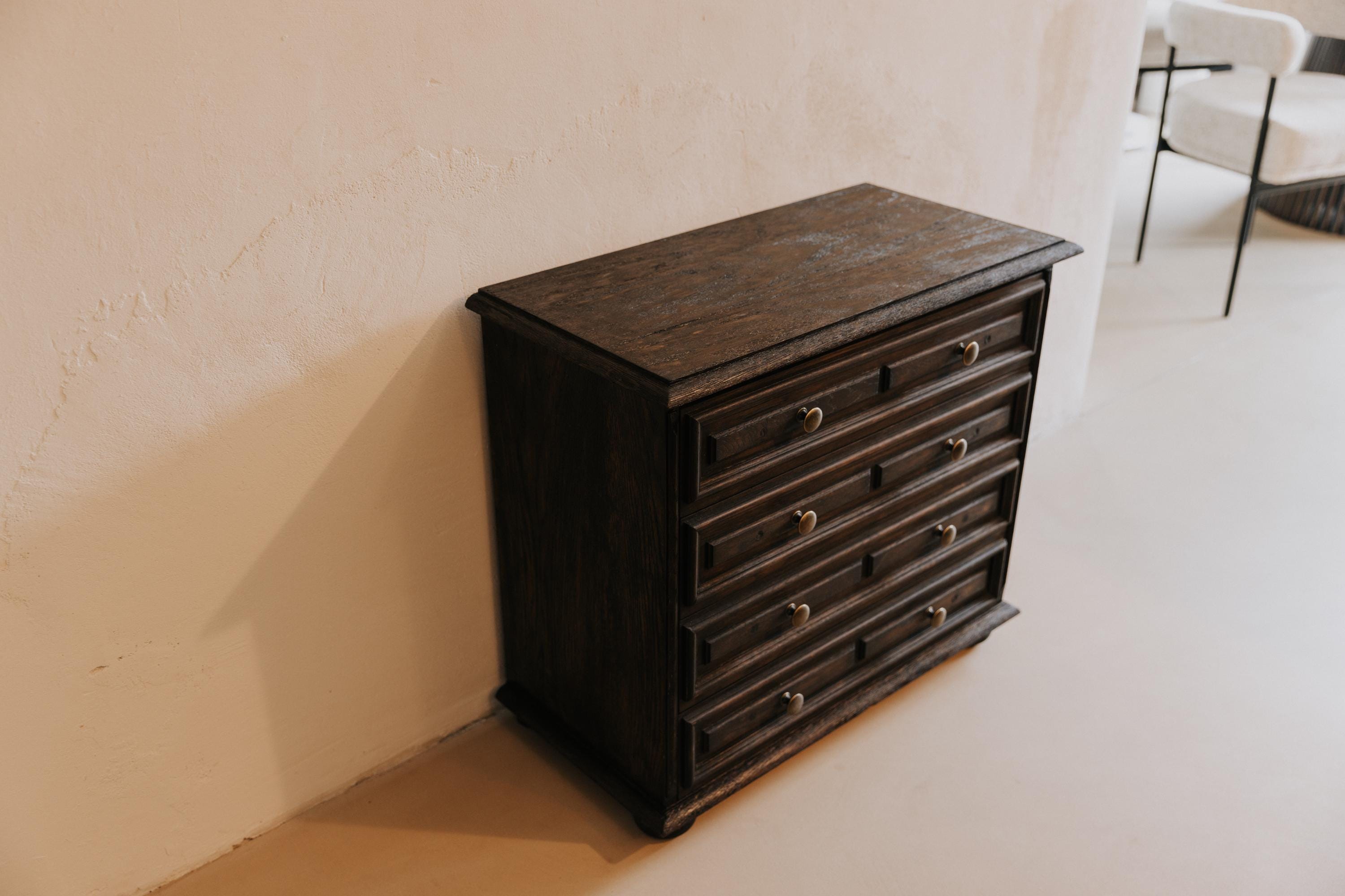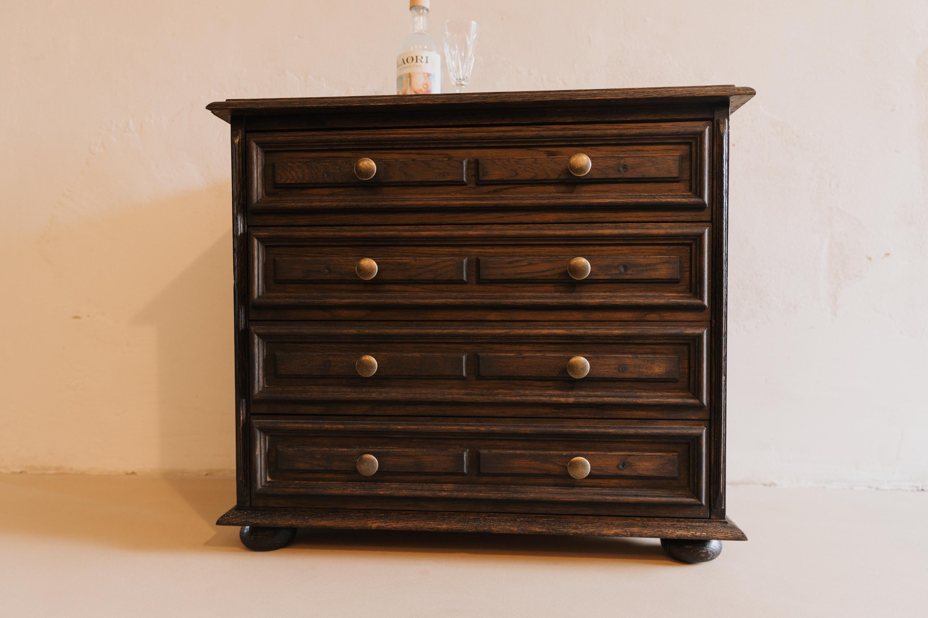 Vintage chest of drawers, antique chest of drawers, solid wood chest of drawers, chest of drawers with 4 drawers, oiled chest of drawers, stained chest of drawers, old wooden chest of drawers, restored chest of drawers, country furniture, hallway chest of drawers, bedroom chest of drawers, 1940s furniture, retro chest of drawers, mid-century furniture, chest of drawers with patina, sustainable furniture, solid wood chest of drawers, small vintage chest of drawers